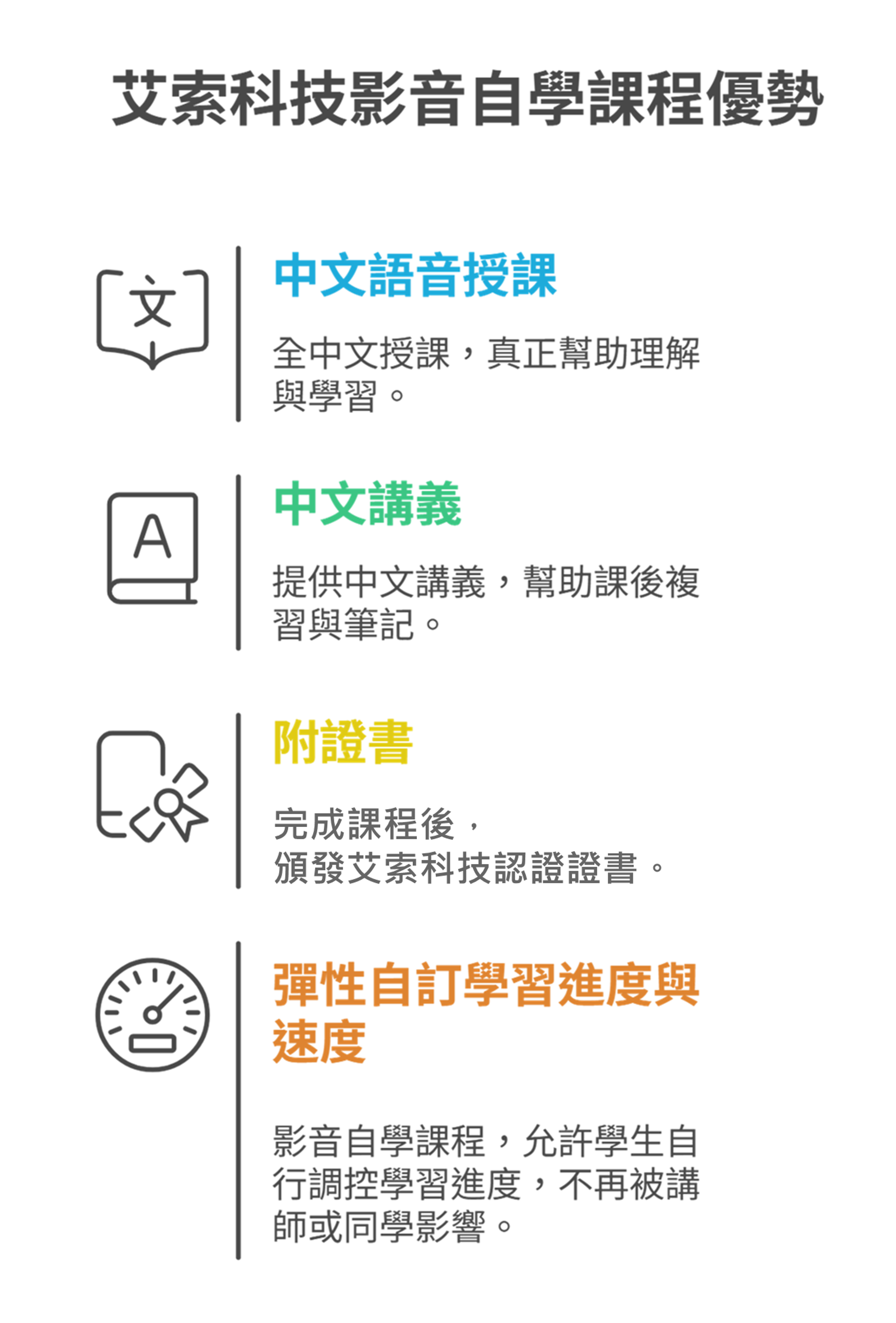 - 本課程為影音教學課程,嚴禁上課時間進行翻拍、錄製、錄音等盜拷行為,若有以上行為,艾索科技保留法律追訴權。