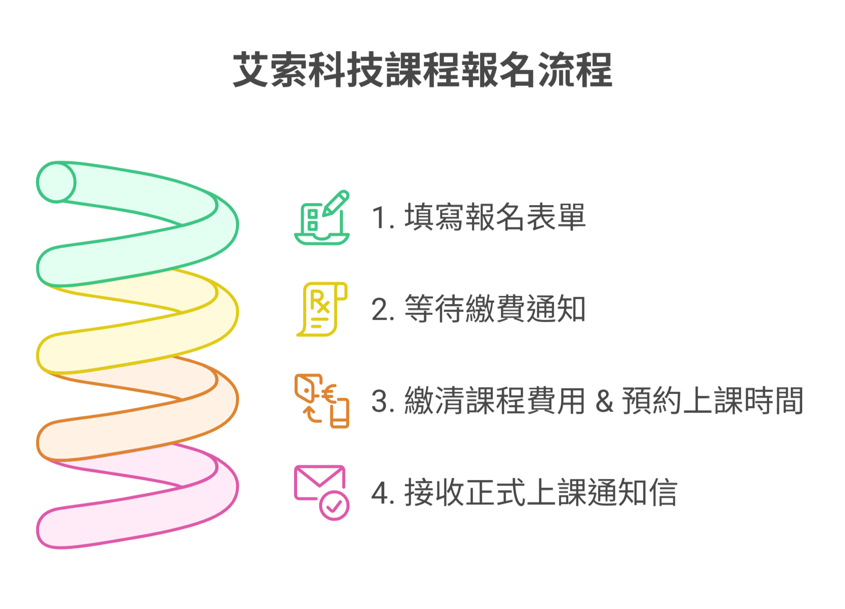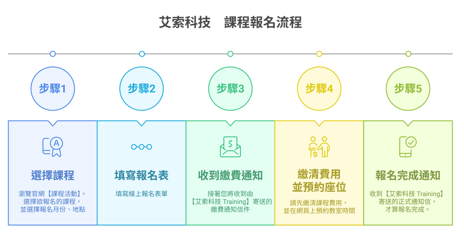 - 請勿偽造或假借他人身份報名上課,如經查證確實,艾索科技有權取消此學員上課權利,且保留法律追訴權。