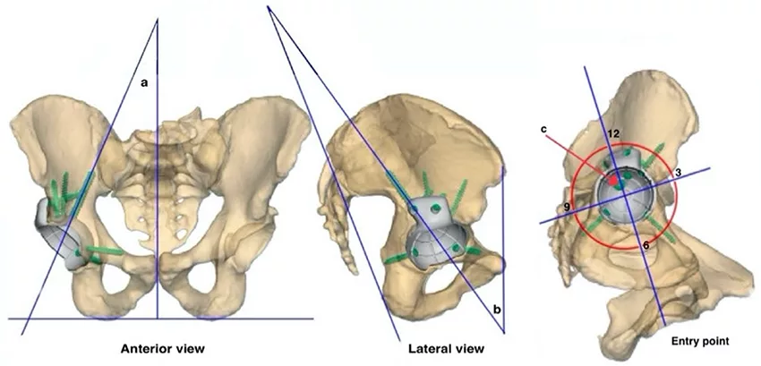 研究分析 96 名接受部分骨盆置換(PPR)患者的 Transiliac Fixation 螺絲置入,透過 CT 影像與三維術前規劃確定最佳 AP 與側向角度及進針點。