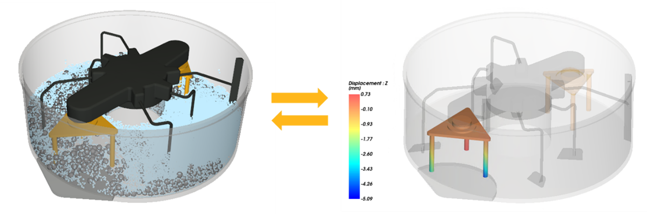 | Rocky 將 DEM/SPH 所產生的力傳遞給 Mechanical 進行變形計算,並將計算出的位移回傳給 Rocky。 |