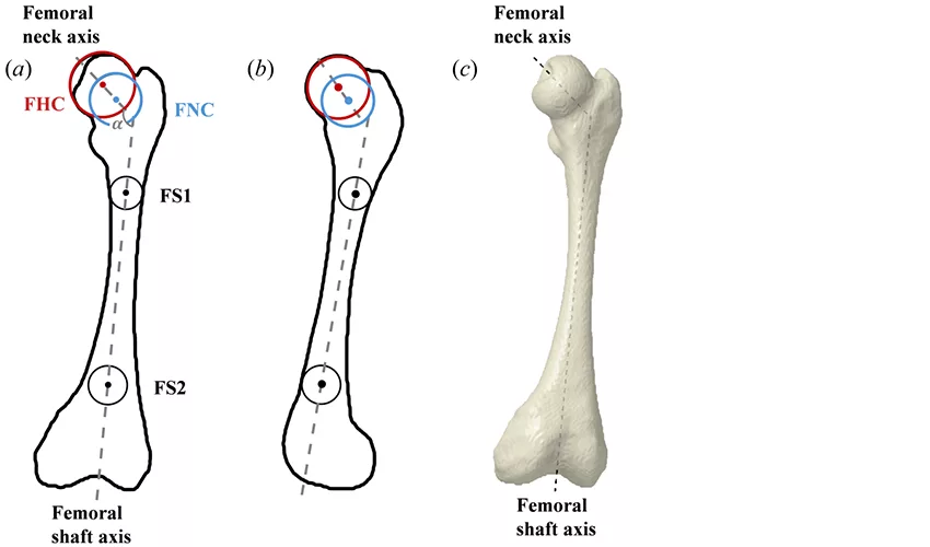 股骨頸-股骨幹角(Neck-Shaft Angle, α)是評估嬰兒髖關節健康的重要指標。傳統測量方法包括股骨在冠狀面與矢狀面的二維(2D)投影,以及三維(3D)CT 模型生成的方法。在 3D 模型中,股骨頸軸定義為連接股骨頭中心(FHC—紅色)與股骨頸中心(FNC—藍色)的直線;股骨幹軸則定義為連接近端股骨幹(FS1)與遠端股骨幹(FS2)中心點的直線。利用 CT 影像生成的 3D 模型可以更精準地測量股骨頸-股骨幹角及前傾角,有助於嬰兒股骨扭轉的評估。