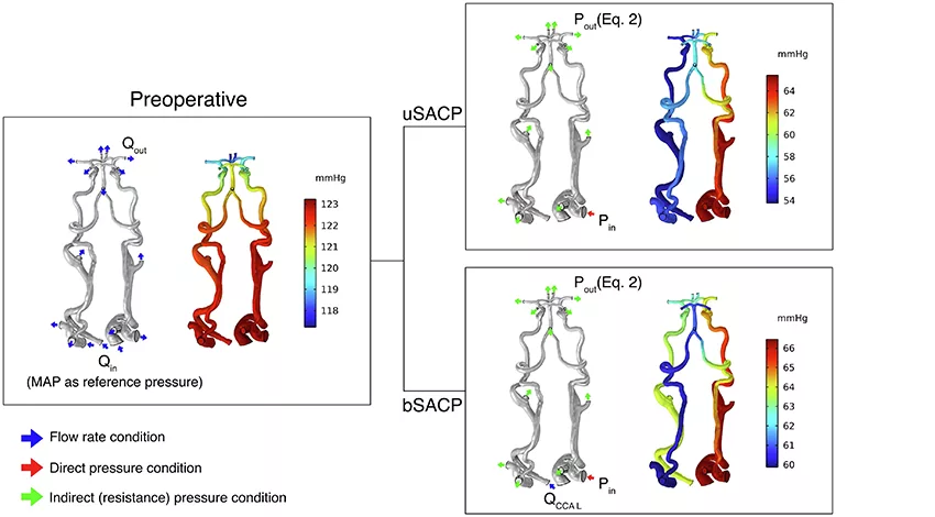 透過這些邊界條件,計算流體力學(CFD)模擬能夠預測 SACP 過程中對側腦半球的 CPP,並與術中測得壓力進行比較。